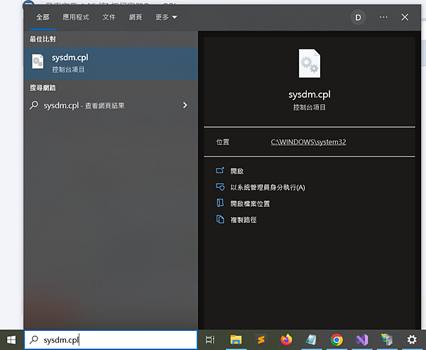 方法二:在工作列的搜尋輸入sysdm.cpl,最佳比對會顯示sysdm.cpl物件,請按下執行。