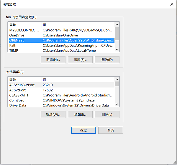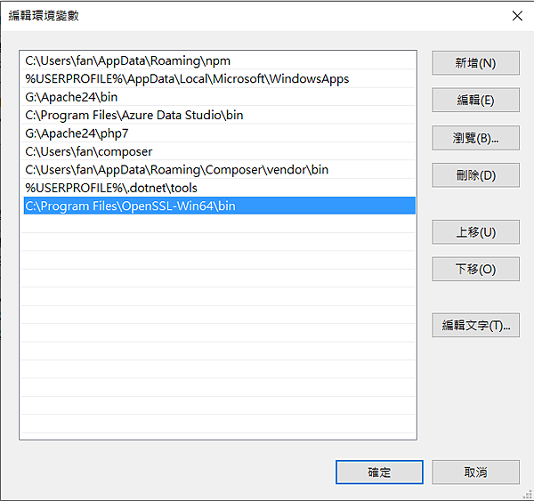 再按下「新增」輸入C:\Program Files\OpenSSL-Win64\bin